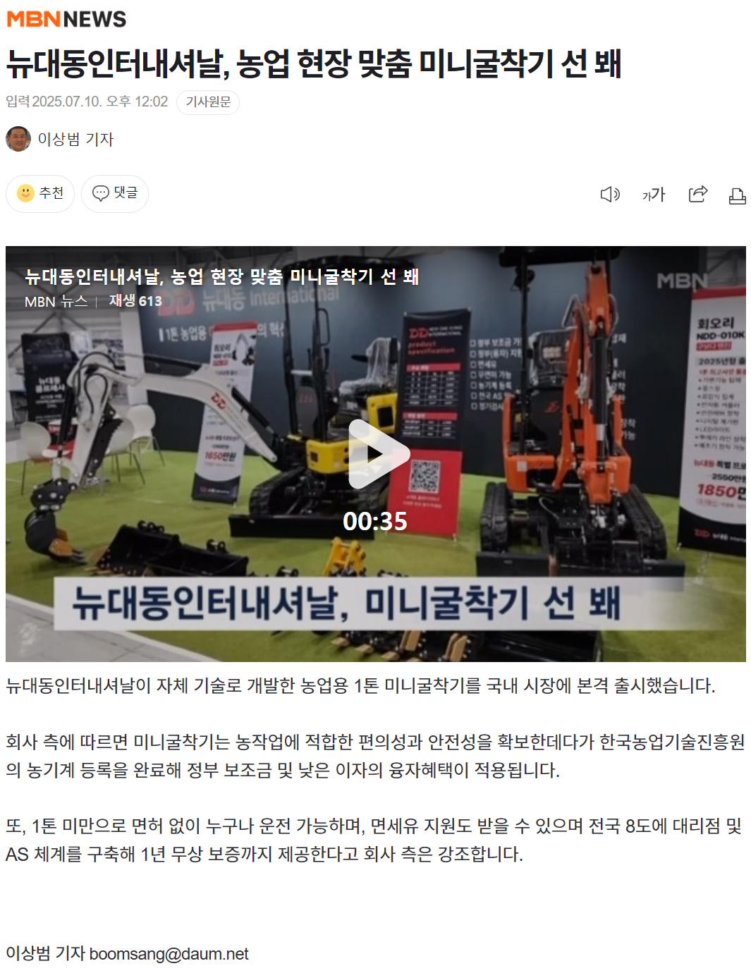 MBN뉴스-뉴대동 농업 현장 맞춤 미니굴착기 선 봬